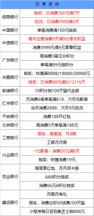 报名参与,每周线上或指定MCC消费满3笔累计满1500元(或满3笔累计满4000元),累计达标相应周数即可参与积分瓜分,最高限获30万积分(按活动期间总消费占比瓜分)