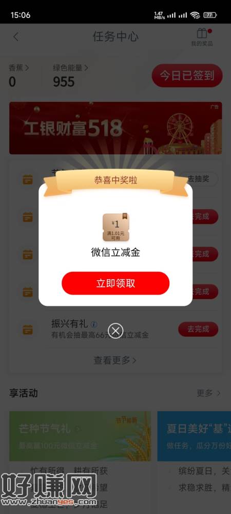 工银兴农通APP,首页,全部,任务中心,有个直接抽的