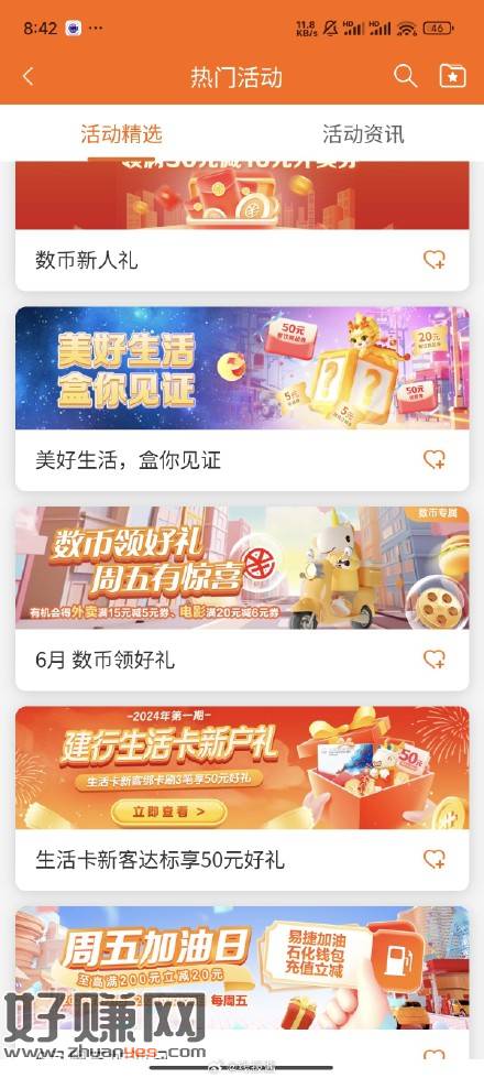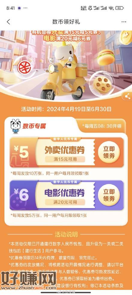 建行生活可领数币外卖15-5,电影20-6,月一次