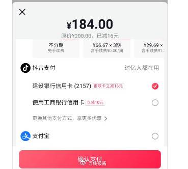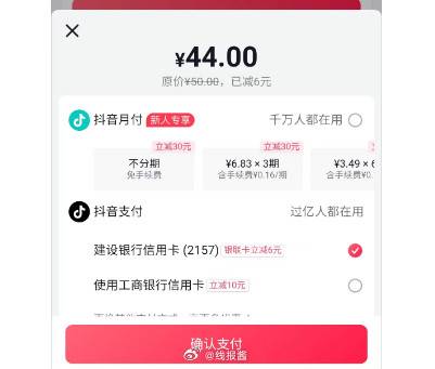 dy冲话费,建行信用卡有50-6和200-16,各一次,付款前可以看到优惠