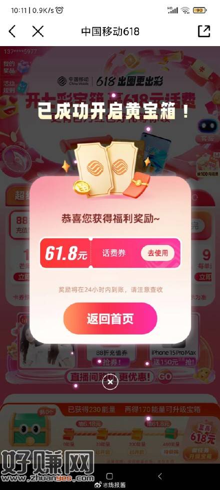 移动搜赢618元话费