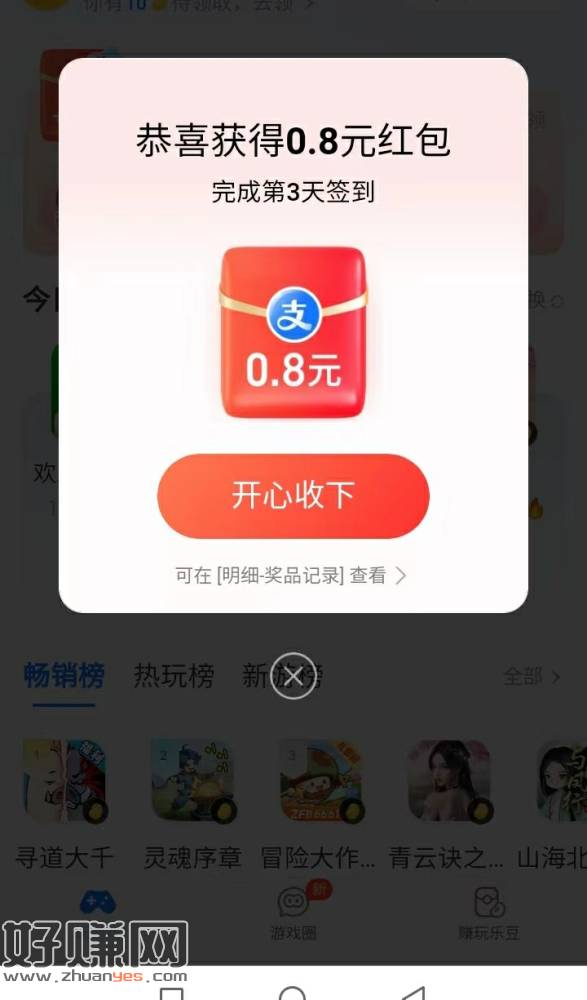 支付宝_游戏中心_有空连续签5天7红包0.8×5+3"长城炼