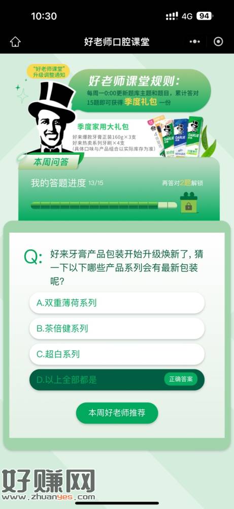 微信打开地址->每周1一道题目,连续答对15周领黑人牙膏礼包