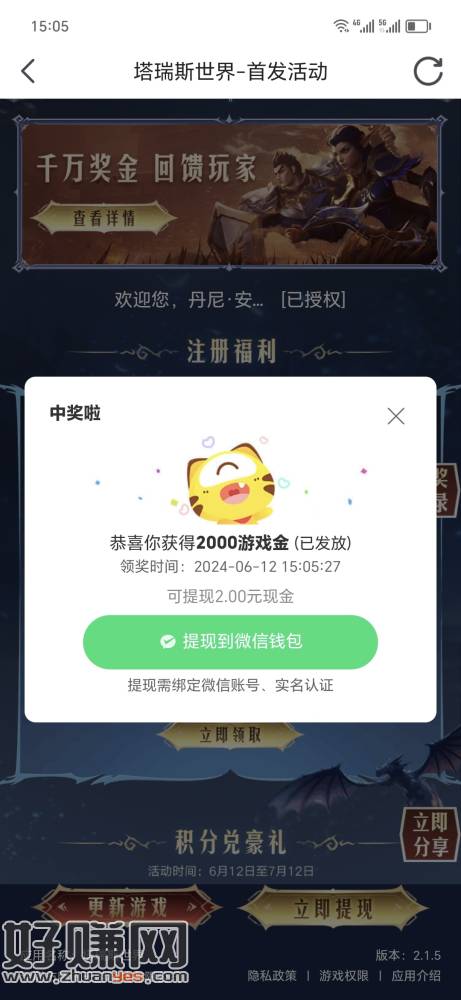 塔瑞斯世界虎牙可以和微信一起领的,别忘了