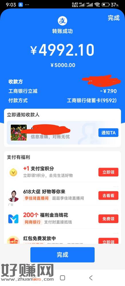 工行福建(除厦门),支付宝转账5000随机减5-10,其他地