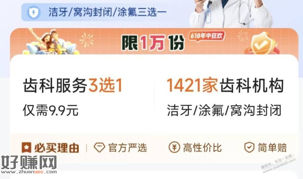 全国通用,1421家齿科机构,洗牙,儿童涂氟,窝沟封闭三选一。