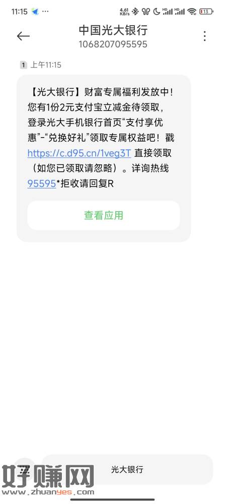 [ 光大银行 ]财富专属福利发放中!您有1份2元支付宝立减金待领