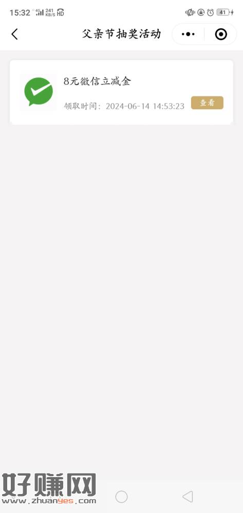 华瑞微银行公众号,父亲节推文,按要求转发朋友圈,可以私密。截图转发的朋友圈到公众号,抽奖。大概率8立减。立减金是券码,没卡的可以出。