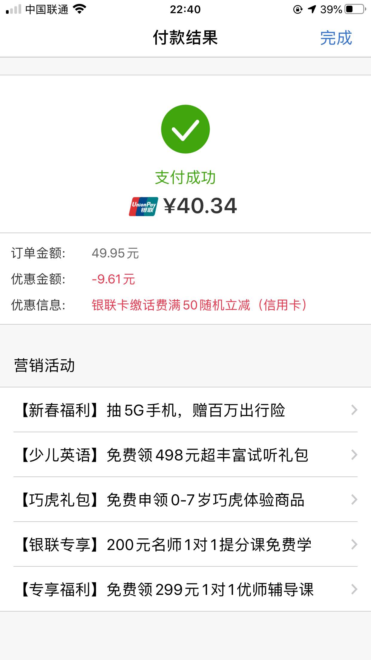 中行xing/用卡缴话费满50最高可减20元啦!即日起,新注册云闪付绑定中行xing/用卡可享满50立减15元,原云闪付绑定中行xing/用卡可享满50元随机立减5-20元。名额有限,用完即止。通过云闪付APP内手机充值操作。活动规则见“银联河北”微信公众号。中行xing/用卡更多优惠详询4006695566退订回复TD#0401【中国银行】