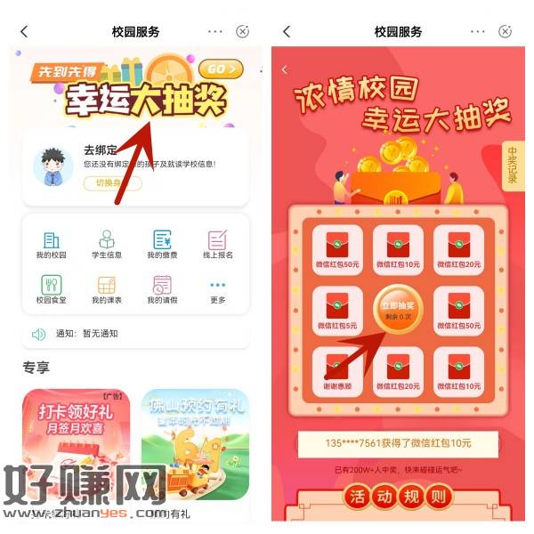 打开“中国农业银行”APP搜索【城市专区】右上角切换为【佛山】,再点【智慧校园】进去,点顶部图片【幸运大抽奖】进去,只有部分用户才能抽
