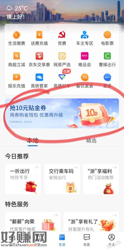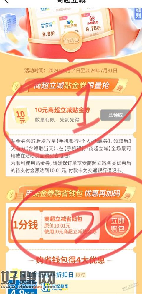 交通银行app,生活进去,滑动横幅,如图所示进去,领取10元超市贴金券,花一分买好,按照图示123,再下拉最后领五元微信红包,秒到
