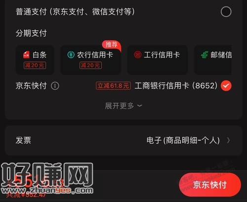 京东快付有减61.8优惠,工行xing/用卡优惠,如图