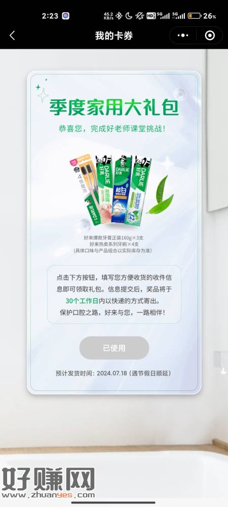 微信打开地址->每周1一道题目,连续答对15周领黑人牙膏礼包