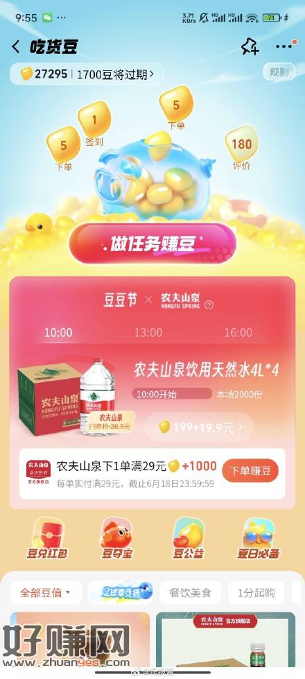 10点,13点,16点饿了么吃货豆换农夫山泉,需要199+19.9,按需吧