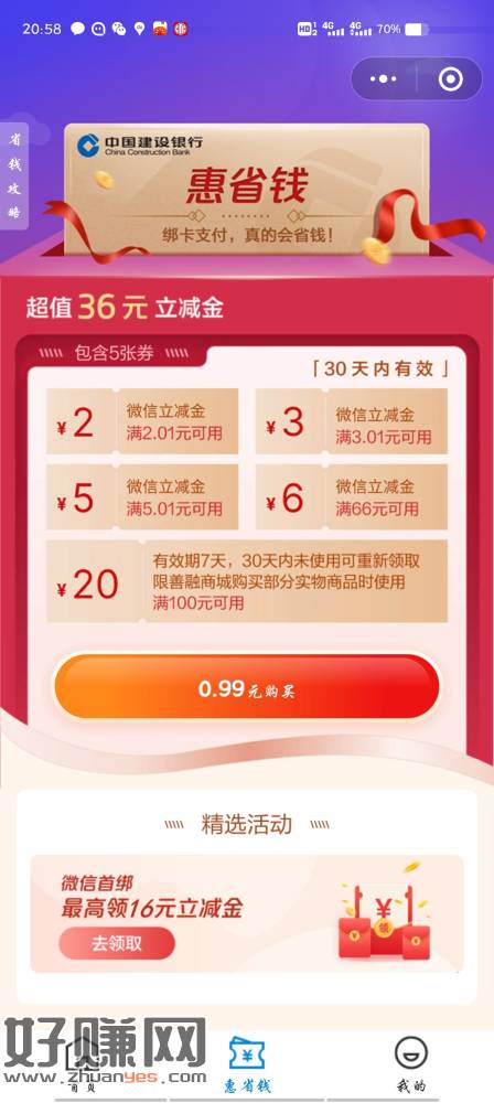 建行 惠省钱 拼手气购买36元立减金,最低0.99元购买,刚中