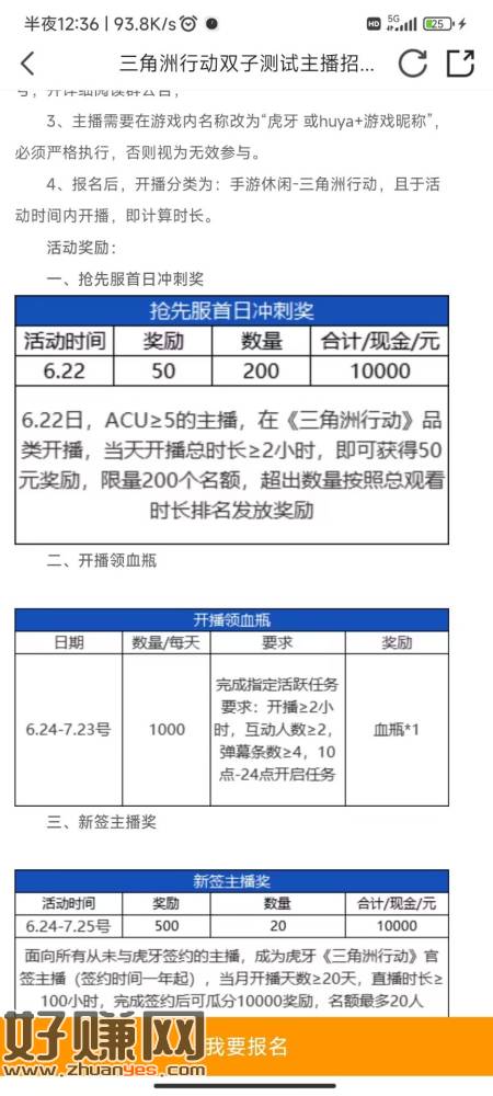 6.22虎牙三角洲直播首日2小时+acu5人,奖励50限量200人