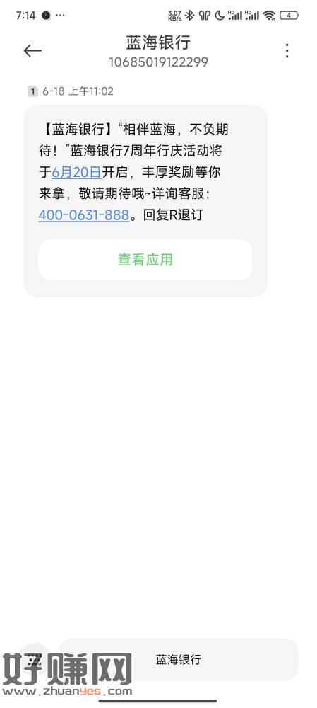 野鸡银行看上的去:【蓝海银行】“相伴蓝海,不负期待!”蓝海银行7周年行庆活动将于6月20日开启,丰厚奖励等你来拿,敬请期待哦~详询客服:400-0631-888。回复R退订