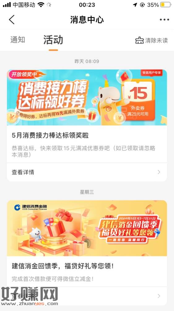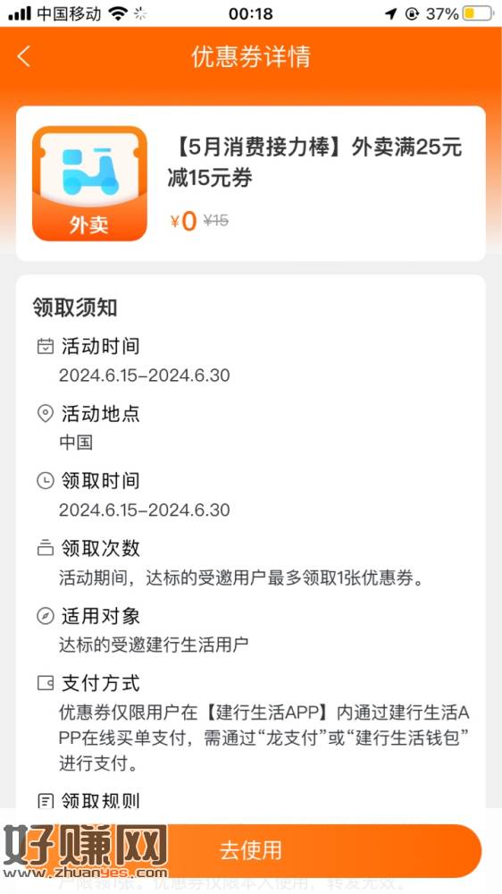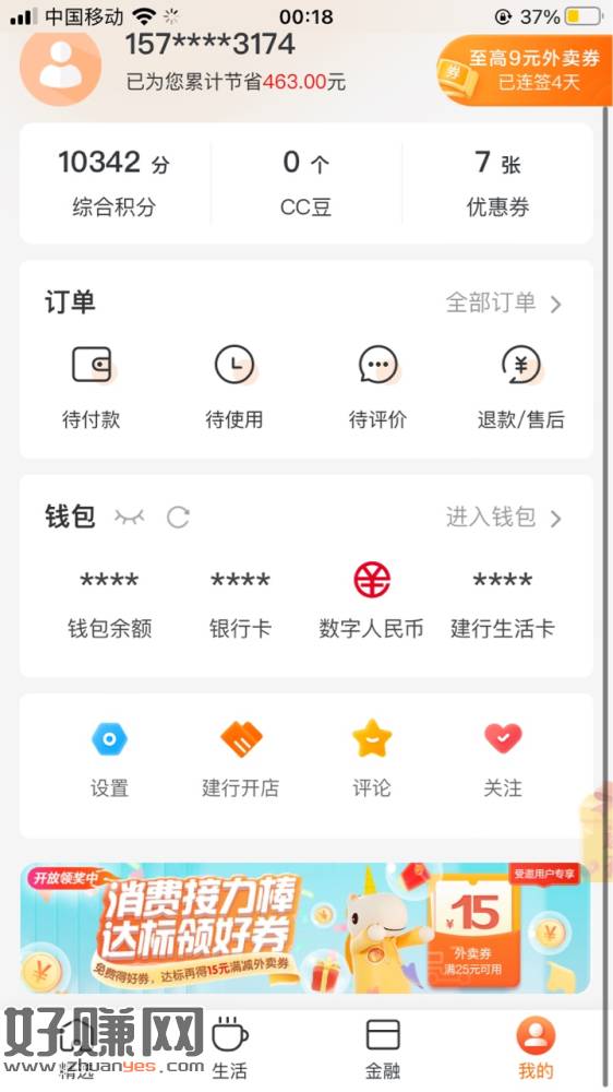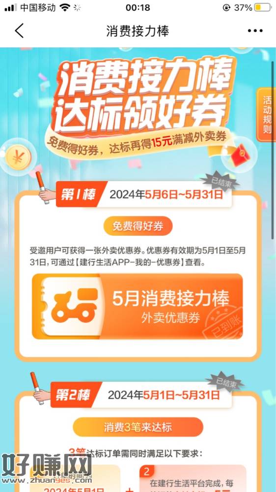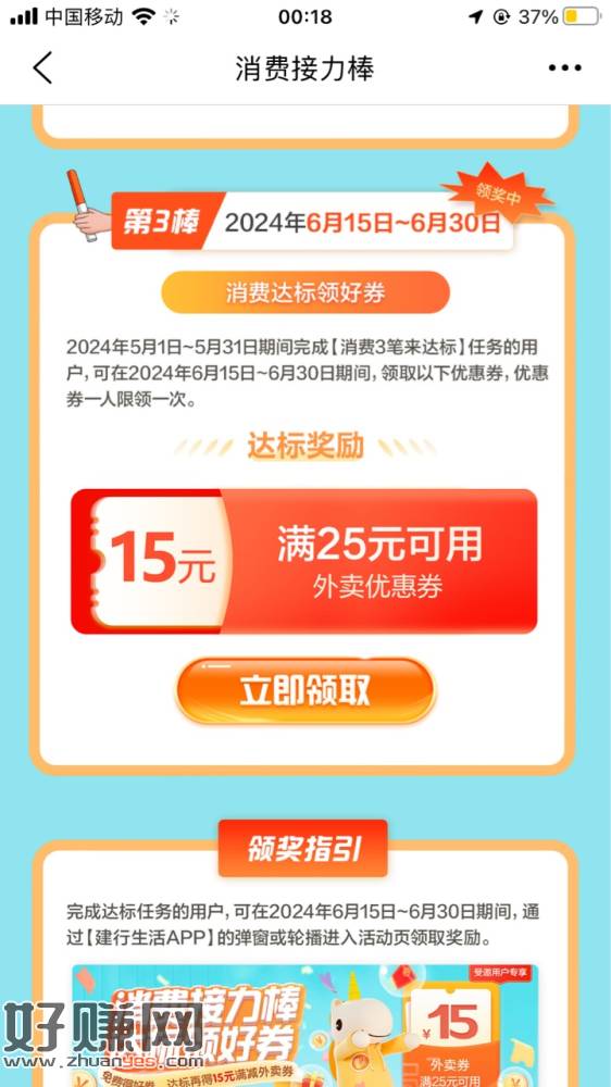 建行生活消费接力棒,达标领好劵,记得领取啊,刚领了张25减15外卖优惠卷,顺便也把那个夏日许愿好礼相随活动抽下奖,