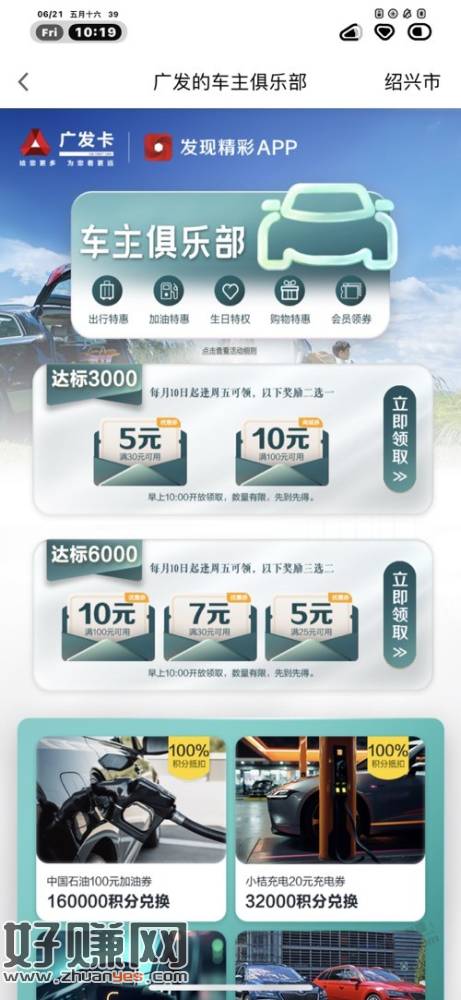 发现精彩app,车主俱乐部,领30-5和30-7,去广发银行app娱乐充值可以买两个30立减金
