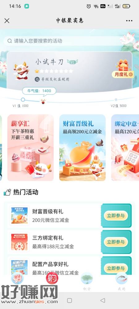 公众号中国银行深圳分行,中银聚实惠点进去有个月度礼可以领2,