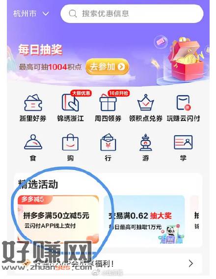 浙江地区,拼多多云闪付有50-5,每天9点开始,每日一次,活动期间两次