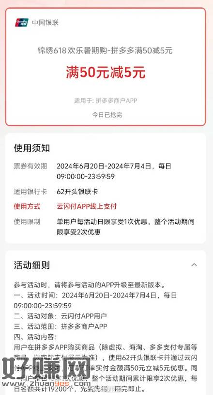浙江地区,拼多多云闪付有50-5,每天9点开始,每