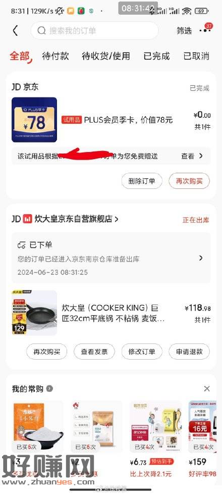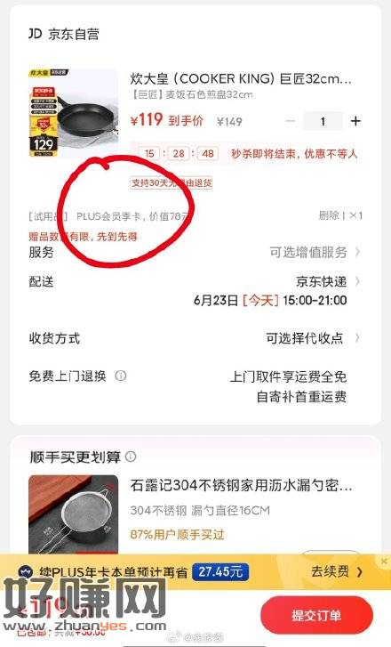 再把锅加车,提交页面显示送plus季卡即可下单,下单后取消订单