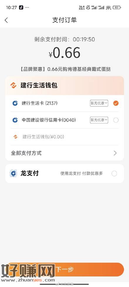建行生活,热门活动,肯德基蛋挞有货,需要信用卡付0.66