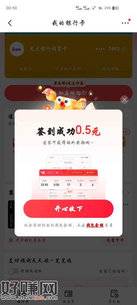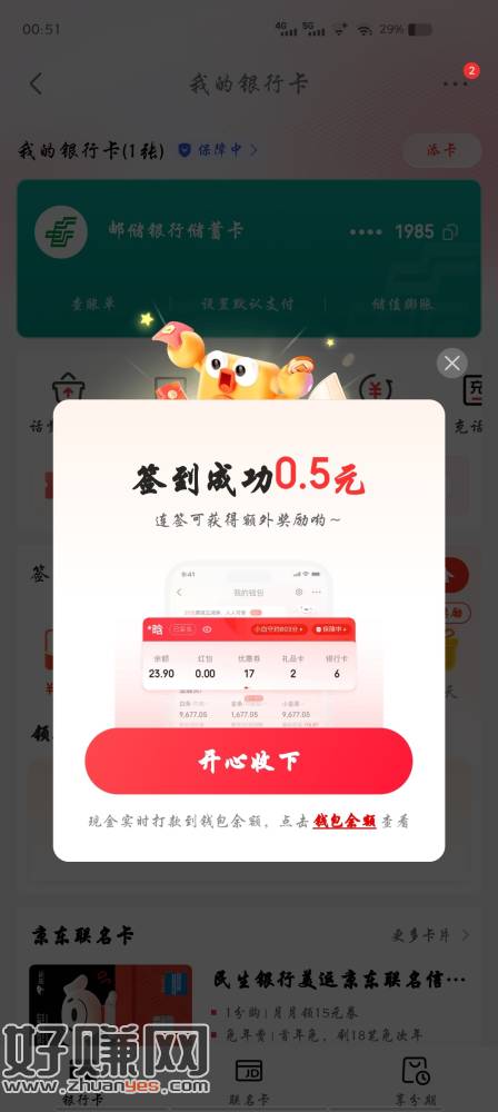 京东-我的-银行卡,里面的签到 签到必中0.5两个号都中了 钱包里面提现
