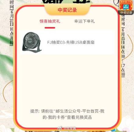 16点30,16点50,17点10分邮生活直播间抽奖,可以中小风扇等