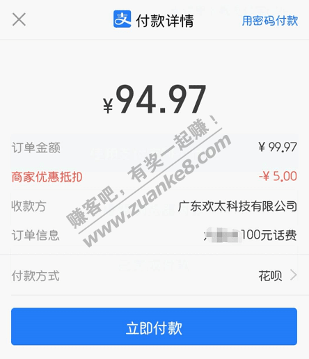 支付宝充值,94.97充100元话费(使用支付宝付):