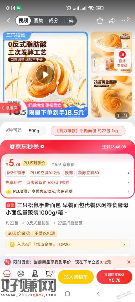 京东自营三只松鼠手撕面包1000克5.78元. 限吉林长春