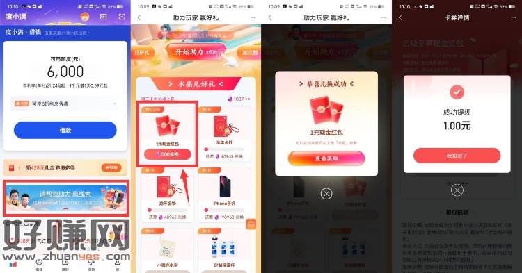 新一期,之前领过的也可以去,打开“度小满金融”APP,首页点中间滚动图片“请帮我助力赢线索”进去,直接用500水晶兑换1元现金红包(如果水晶没有500就玩几把游戏就能得到),兑换的现金红包在24小时审核通过后就可以提现到银行卡,这个活动每周三10点之后都可以领1次