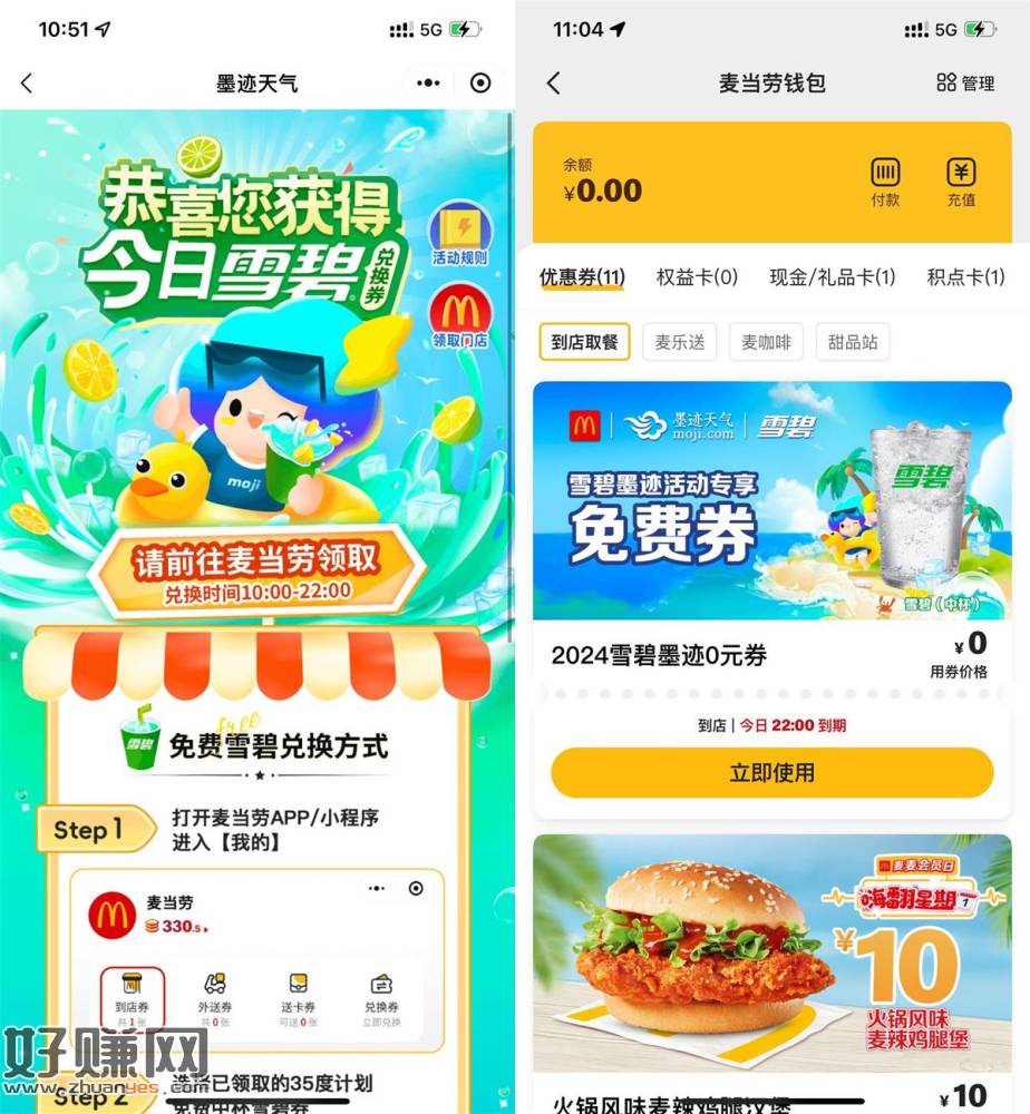 墨迹天气&麦当劳每天免费领雪碧进入小程序【墨迹天气】点击弹窗进去,城市气温超过35度可以免费领1杯雪碧!雪碧券直接到店核销领取,无需消费!