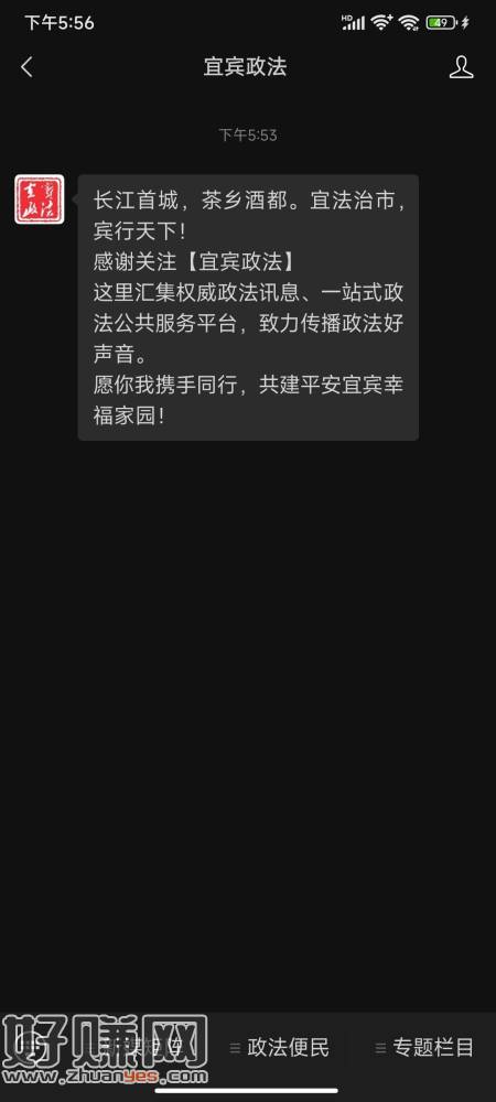 打开微信关注宜宾政法公众号,右下专题栏目点进去,点击第一个线