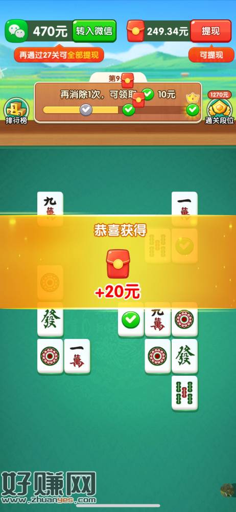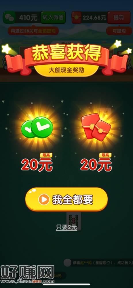 苹果手机下载:富贵连连,玩消消乐看广告,前面一个2毛,后面1毛7,越看越少,建议升级到10,提现多些,下图广告就点了看,出现绿色的那个20元红包直接不领跳过,有红色的20元就看,我提了4.86刚刚