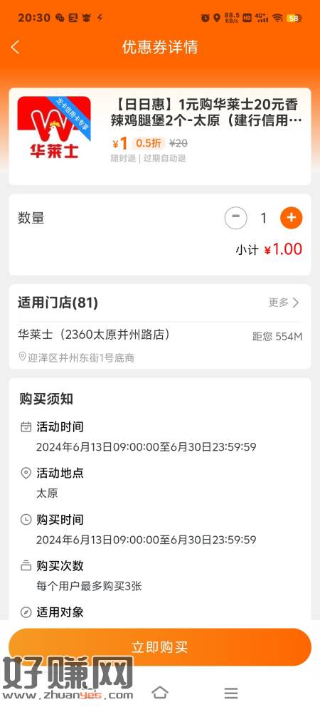 1元购2个香辣鸡腿堡,
