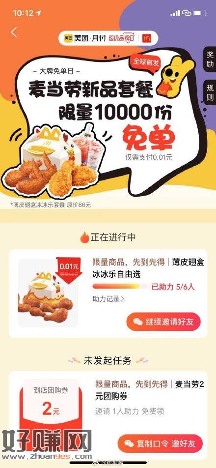 美团搜月付大牌免单,今天开通月付(类似花呗,风险自测)有送麦当劳套餐,需要6人助力