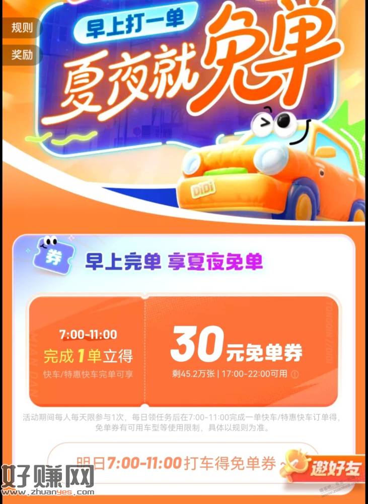 早上7点到11点打车,然后得一张30免单券,限当天17到22点打车使用