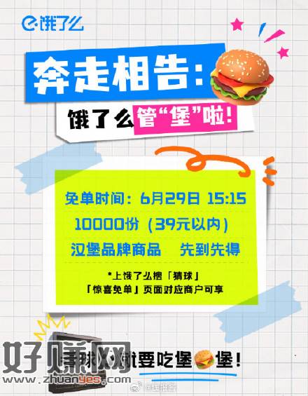 6月29日15:15,饿了么搜[ 猜球 ]有汉堡品牌免