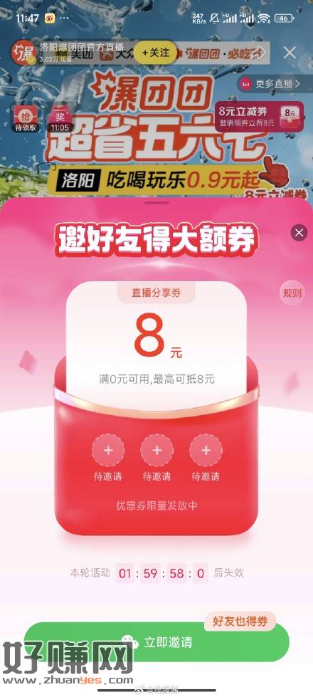 美团首页切洛阳地址,再搜6666,进直播间右上角有邀请送八卷,可以买汉堡等
