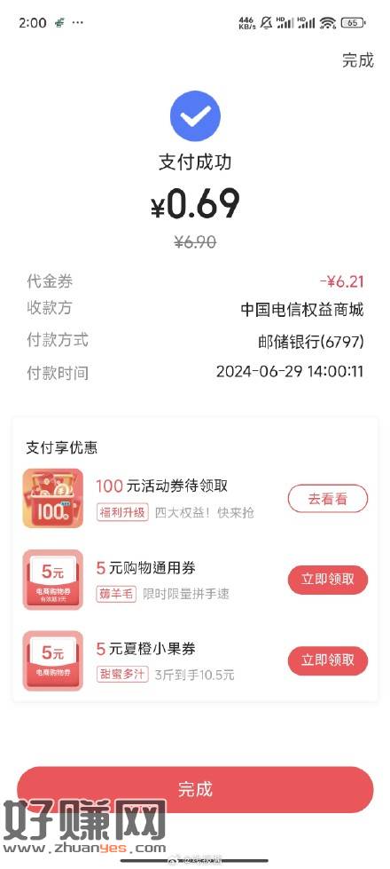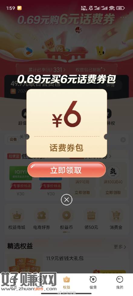 电信用户,翼支付App-权益-权益商城 横幅 0.69买2张6-3话费券,最后一步付款出优惠,买完进去领话费券,另外陪你过周末里,下拉2元话费券可以领