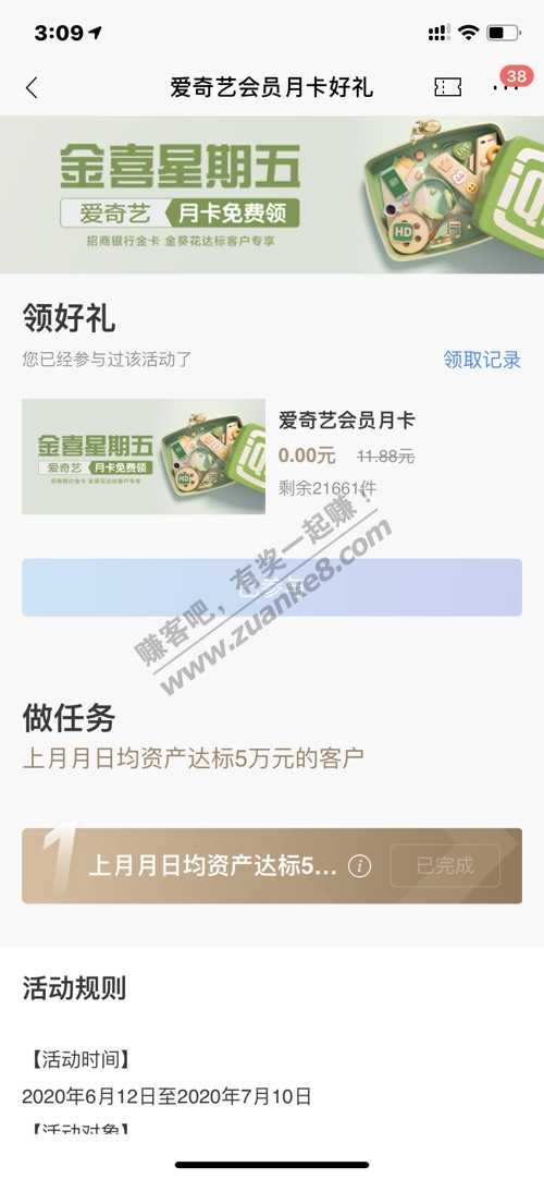 招行上月日均5万免费领爱奇艺月卡。速度。