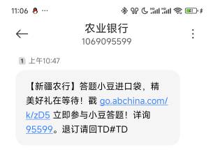 上课上课 【新疆农行】答题小豆进口袋,精美好礼在等待!戳 go.abchina.com/k/zD5 立即参与小豆答题!详询95599。退订请回TD#TD