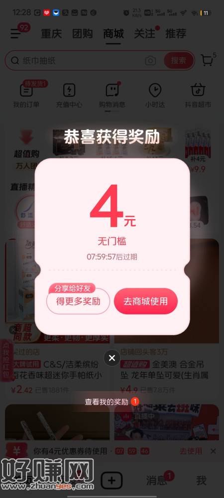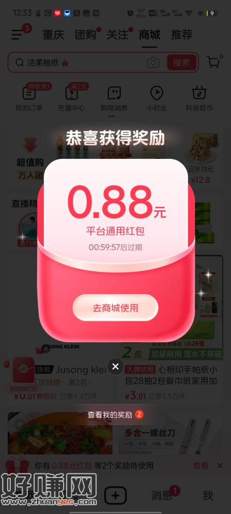 【抖音】商城页浮窗开锦鲤红包,概率出无门槛(亲测),分享好友会直接领到小额红包(限商城使用)