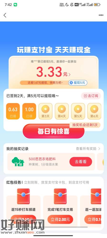 支付宝搜索玩转支付宝 随便做一下任务就可以提现五元