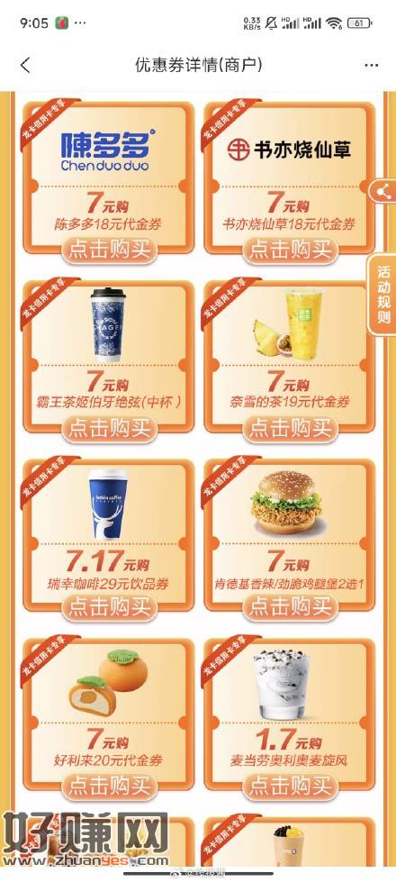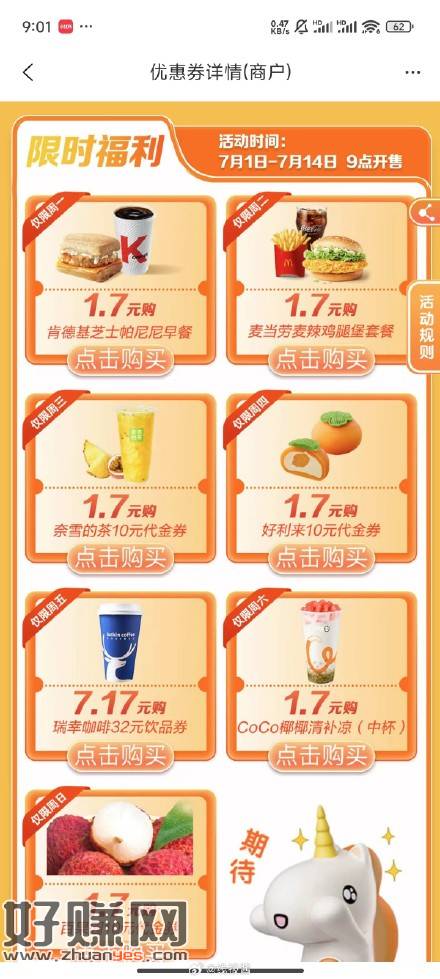 截至7.14,建行生活首页1.7元起购,周一肯德基周二麦当劳周三奈雪周四好利来周五瑞幸周六Coco周日百果园,基本上喵呜