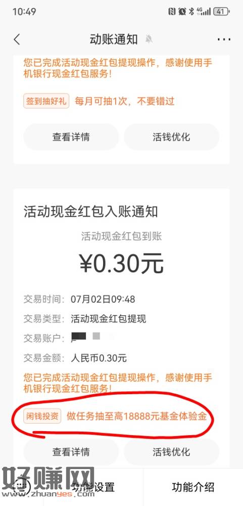 招行到账通知,看我圈起来的地方,每一笔下面都有一个活动,点进去薅体验金!