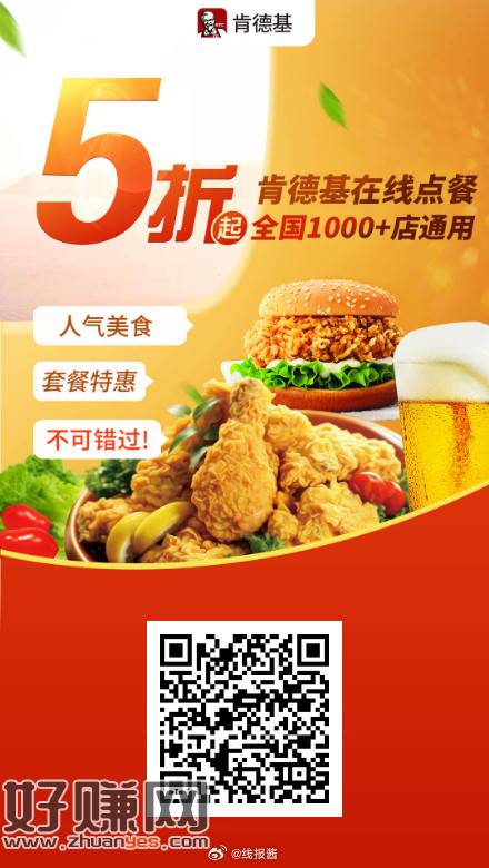 肯德基疯狂星期四,2个原味鸡9.9,微信扫码点的话