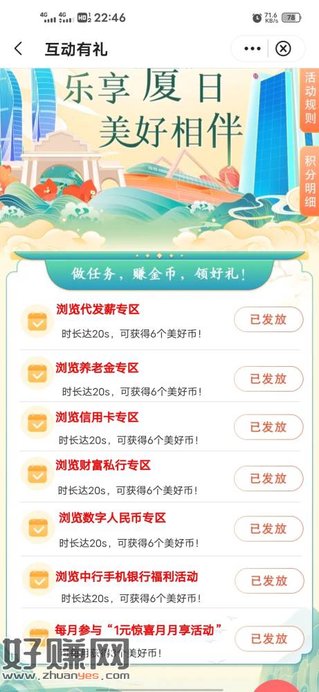 乐享夏日,互动有礼 进去把浏览任务做完,可以换两张5E卡 还有剩的币,速度冲